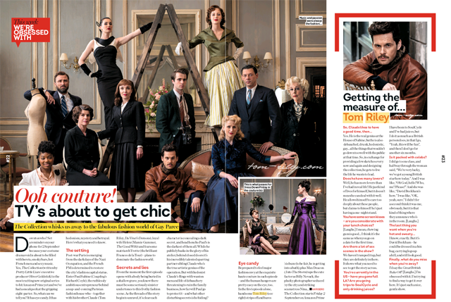 Heat magazine posts news of Tom's obsession with the Great British Bake Off and Claude Sabine's many lovers, Tom tells Total TV Guide what a godsend it is not having to keep his body in same the 'absurd shape' as he did for Da Vinci's Demons, while in TV Choice there is a new promotional photo of Tom as Claude Sabine to accompany his interview. Sorry about the scan quality.
